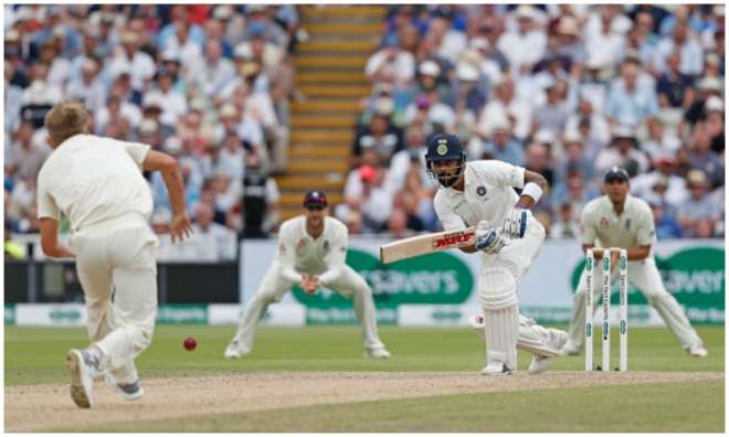 ENG 287, 180 IND 274, 110/5 (36.0 Ovs) भारत और इंग्लैंड के बीच खेले जा रहे पहले टेस्ट मैच का आज चौथा दिन है। खेल का चौथा दिन इतिहास के सुनहरे पन्नों में दर्ज हो सकता है और इसकी वजह ये है कि आज खेल का नतीजा हर हाल में निकल आएगा। भारतीय टीम के पास आज पहला टेस्ट जीतने का बेहद आसान मौका है और टीम इंडिया का इरादा पहले टेस्ट को जीतकर 5 मैचों की टेस्ट सीरीज में 1-0 की बढ़त बनाने का होगा। अब तक के खेल की बात करें तो दोनों टीमों में सिर्फ 1 खिलाड़ी ने फर्क पैदा किया है और वो है विराट कोहली। कोहली ने दोनों पारियों में टीम इंडिया के लिए उपयोगी पारियां खेली हैं और यही मायनों में इंग्लैंड की टीम सिर्फ कोहली से ही लड़ती नजर आ रही है। मैच में भारत का पलड़ा भारी है लेकिन इंग्लैंड को नजरअंदाज करना बेहद मुश्किल होगा। नतीजा कुछ भी हो लेकिन जैसा कि पहले तीन दिन बेहद रोमांचक टक्कर देखने को मिली है, वैसा ही कुछ चौथे दिन भी देखने को मिल सकती है और भारत के लिए मैच जीतने के लिए जी जान लगानी होगी। नमस्कार दोस्तों, इंडिया टीवी हिंदी की लाइव कवरेज में आपका स्वागत है और इंडिया टीवी हिंदी आपको चौथे दिन के ऐक्शन की हर खबर से रूबरू कराएगा।
